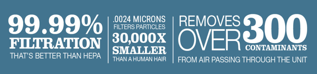- Removes 99.999% of airborne particles as small as 0.0024 microns (30,000 times smaller than a human hair) all from one unit.