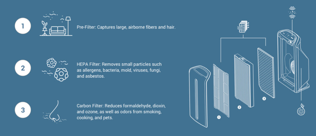- Three-stage filtration includes a washable pre-filter (captures large, airborne fibers and hair), a replaceable HEPA filter (removes small particles and smoke), and a replaceable carbon filter (reduces household odors and other contaminants).